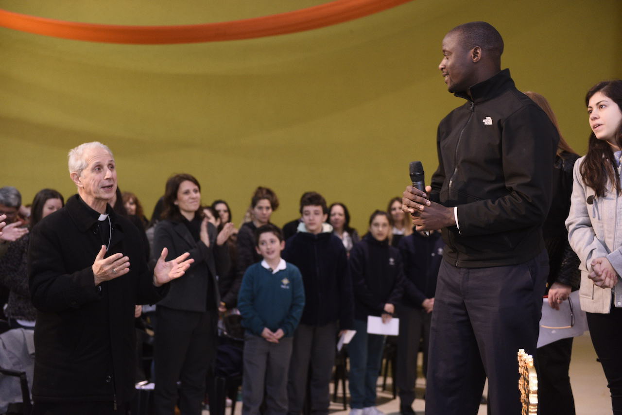 El cardenal Mario Poli le agradece su testimonio al maestro del año 2019, Peter Tabichi, hermano que pertenece a la orden religiosa católica franciscana, quien rezó, al finalizar el encuentro, el Avemaría en su lengua materna: el swahili. Tabichi nació en Kenia, África Oriental.